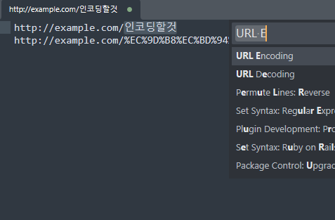 ]ctrl+shift+p 팔레트 메뉴에서 URL Encoding 으로 호출하면, 선택한 문자열이 URL Encoding된 문자열로 치환된다.